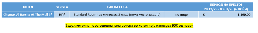 28-29.12/25 - Полетување од Скопје во 12:40. Слетување во Истанбул на аердором Sabiha Gökçen во 16:05 часот. Полетување за Дубаи во 22:15 часот и слетување во Дубаи во 03:50 на 28.12. Трансфер до хотел Citimax Hotel Al Barsha At The Mall во Дубаи. Ноќевање.