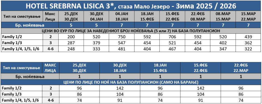 – Доплата за Ручек 10€ по лице по ноќ за возрасни; Деца до 11,99 години 5€ по по ноќ;